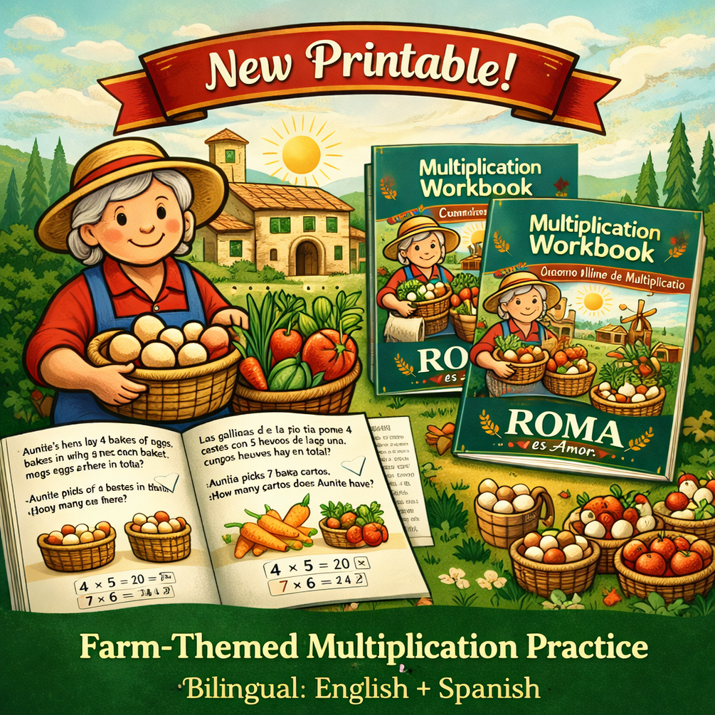 A fun, farm-themed bilingual multiplication workbook for kids, inspired by Auntie’s Farm, the Magolas (hens), eggs, and vegetables from the garden. This printable PDF helps children practice multiplication using equal groups, cartons, bundles, and arrays through simple word problems in English and Spanish.
